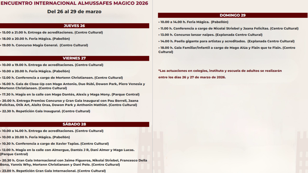 inscribirse al encuentro inscribirse a la feria PROGRAMA DEL ENCUENTRO NUESTRO MAGO DE HONOR 2026 Conde Ropherman artistas confirmados Yannis Why Alaitz Oraa Jaana Felicitas Mortenn Christiansen Er Mago Antonio Antonin Mathiot Dani Polo Alúa y Flain Dowon Park Mony la maga Jaime Figueroa Nikolai Striebel Piero Venesia Otik Art Duo Francesco Dellabona Dantes Junior Almer Alexis Magic Xavier Tapias Dani Almer Mago Dantes Pau Borrell